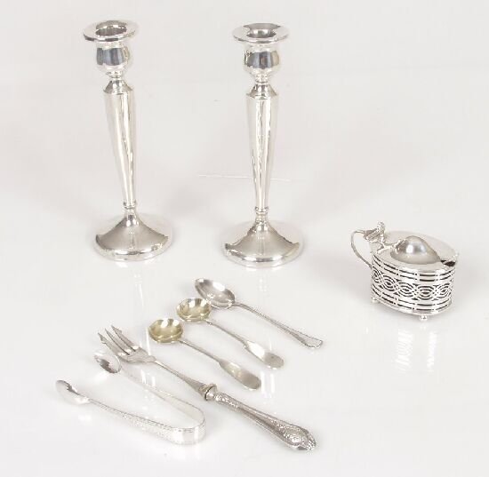 Estate lot misc. STERLING SILVER including one pair weighted bottom candlesticks, and misc.Apr 10, 2026STERLING SILVER lot to include pair weighted bottom candlesticks, (2) weighted bottom bud vases &Apr 10, 2026Pair of George III Candlesticks and Two Candelabra Inserts,STERLING & PLATED CANDLESTICKS & FLATWARE5 days Left(12) SILVERPLATE ITEMS, MAR-A-LAGO & MORE4 days LeftPair of Wm. B. Durgin Co. Sterling Silver Candlesticks10 hrs LeftA Collection of English Sterling and Silverplate Table Articles4 days LeftSet of 4 Silvered Metal Tennis Racket CandlesticksMar 28, 2026EIGHT ASSORTED SILVER AND SILVER PLATED CANDLESTICKS 19th/20th CenturyMar 25, 2026Six-piece Gorham 'Medallion' Silverplate Coffee and Tea Service and Six Coin Silver Tablespoons,A pair of English Birmingham 1808 Sterling Weighted Candlesticks3 days LeftVintage Pewter Tableware Lot: John Somers, Wilton Columbia, Empire, KSMar 29, 2026Collection of Weighted Sterling CandlesticksMar 26, 2026COLLECTION OF AMERICAN AND ENGLISH PEWTER. Largest, 11.75"h.2 days LeftGrouping Of Sterling Silver TablewareMar 28, 2026Grouping Of Sterling Silver TablewareMar 28, 2026