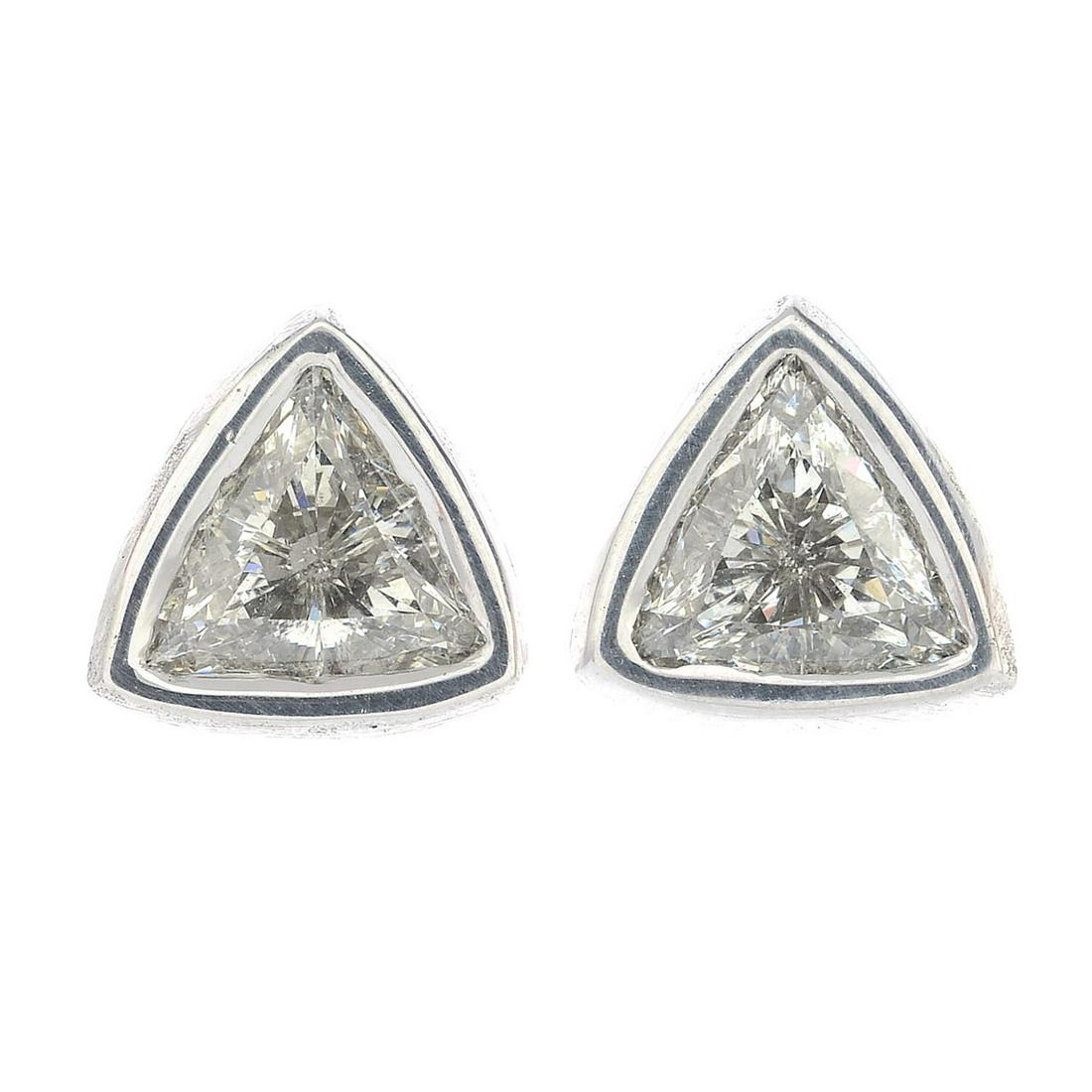 A pair of triangular-shape diamond collet earrings.