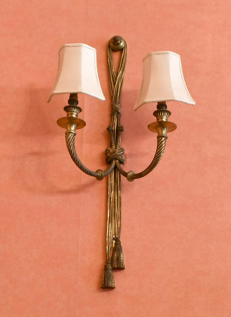 A PAIR OF TWO-LIGHT WALL SCONCES.