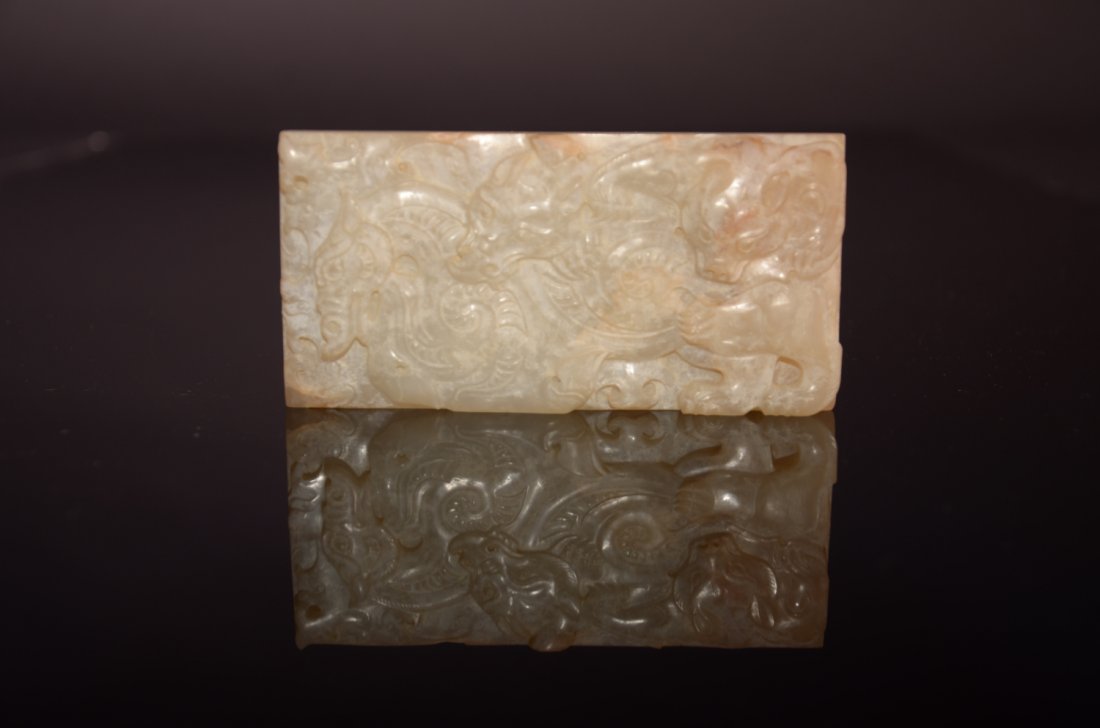 A PALE CELADON JADE TABLET DECORATED ANIMALS