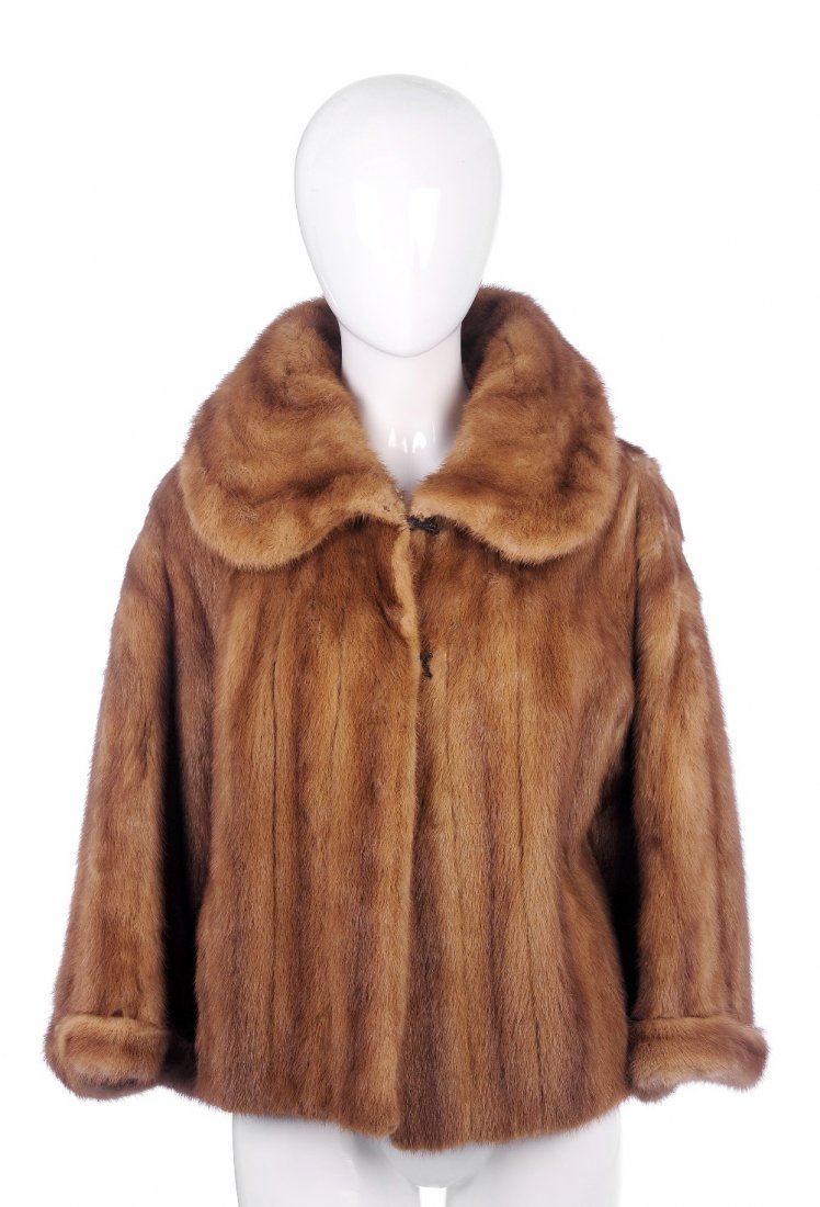 SoldA pastel mink cropped jacket. Designed with a notchedA pastel mink cropped jacket. Designed with a notched lapel collar, flared back, hook and eye clip fastenings, decorative front buttons and one inner pocket. Labelled Faulkes Edgbaston Birmingham. BelSee Sold Price