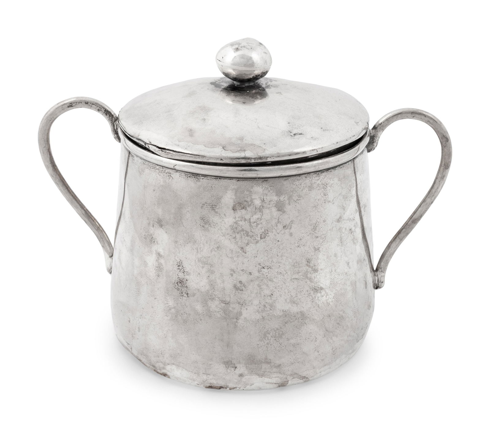 SoldFOUR PIECES OF OTTO WOLTER GERMAN SILVER: 21 TROYLot of four pieces of German silver by Otto Wolter. Includes a 8.75" wide footed bowl, a 6" tall fluted rim vase, a small 7" tall teapot (repaired handle), a 3.75" tall lidded sugar dish. All pieces aSee Sold Price