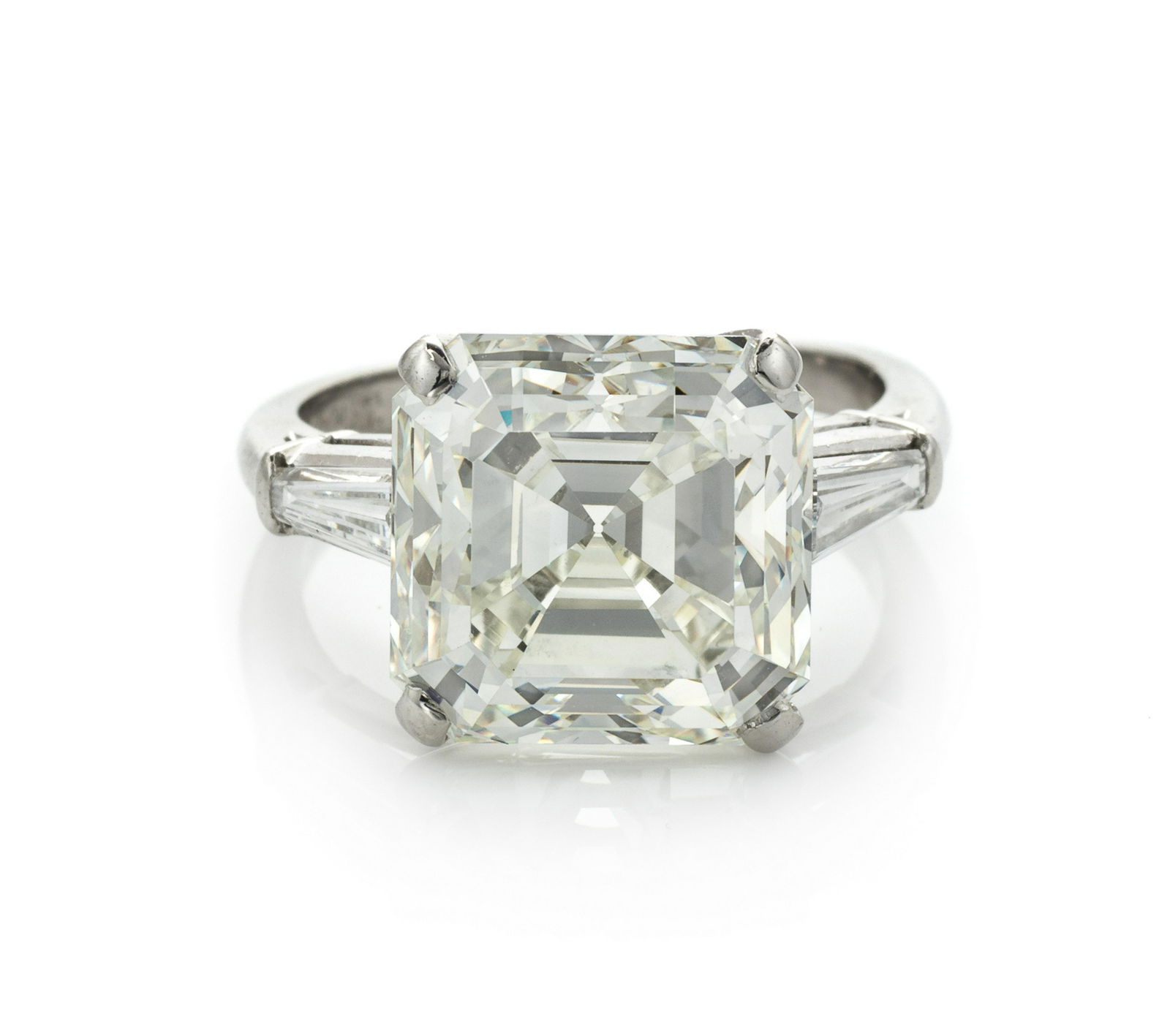 Sold3.3 Carat Asher Cut Platinum Diamond RingExtraordinary Art Deco 3 1/3 ct platinum, diamond and emerald ring, 4.1g. Diamond 3 1/3 carat Asher cut VS2 clarity, K color in 4 prong setting. 6 marquise cut, 4 bezel set diamonds and 2 triangular bSee Sold Price
