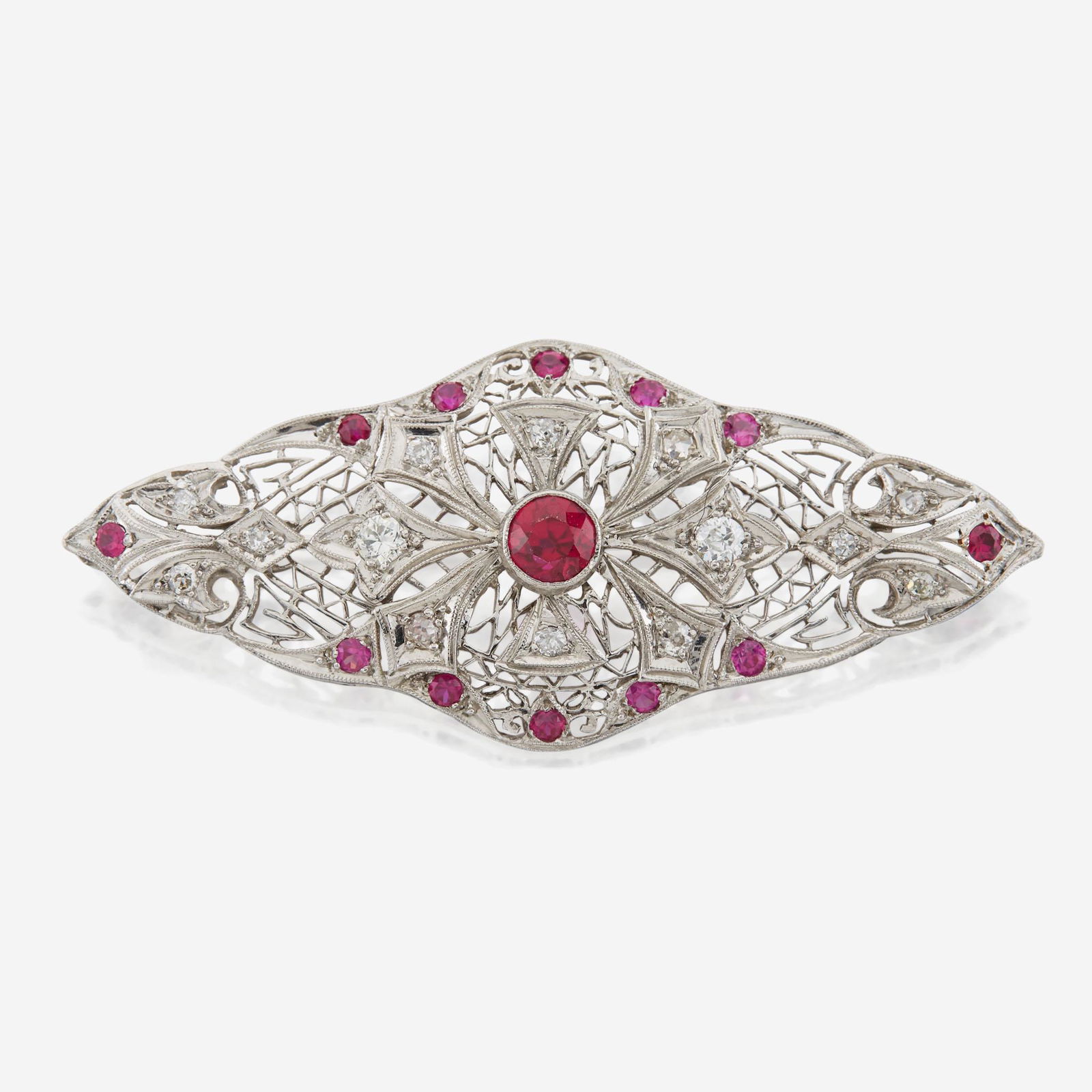A platinum, diamond, and ruby brooch