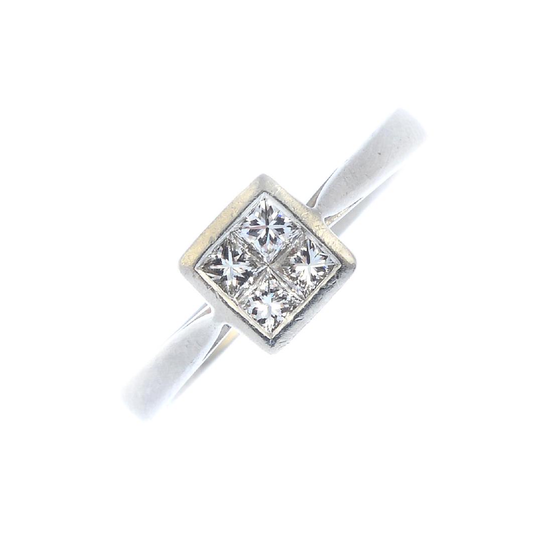 SoldA platinum diamond single-stone ring.A platinum diamond single-stone ring. The square-shape diamond, to the tapered shoulders and plain band. Estimated diamond weight 0.40ct, I-J colour, SI clarity. Hallmarks for Birmingham, 2001. WeightSee Sold Price
