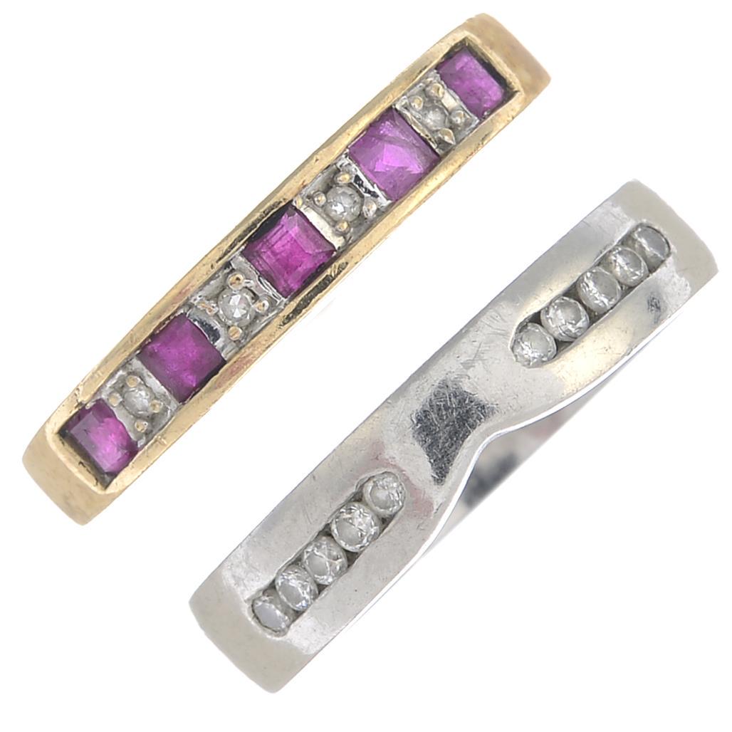 A platinum diamond shaped band ring and a 9ct gold ruby