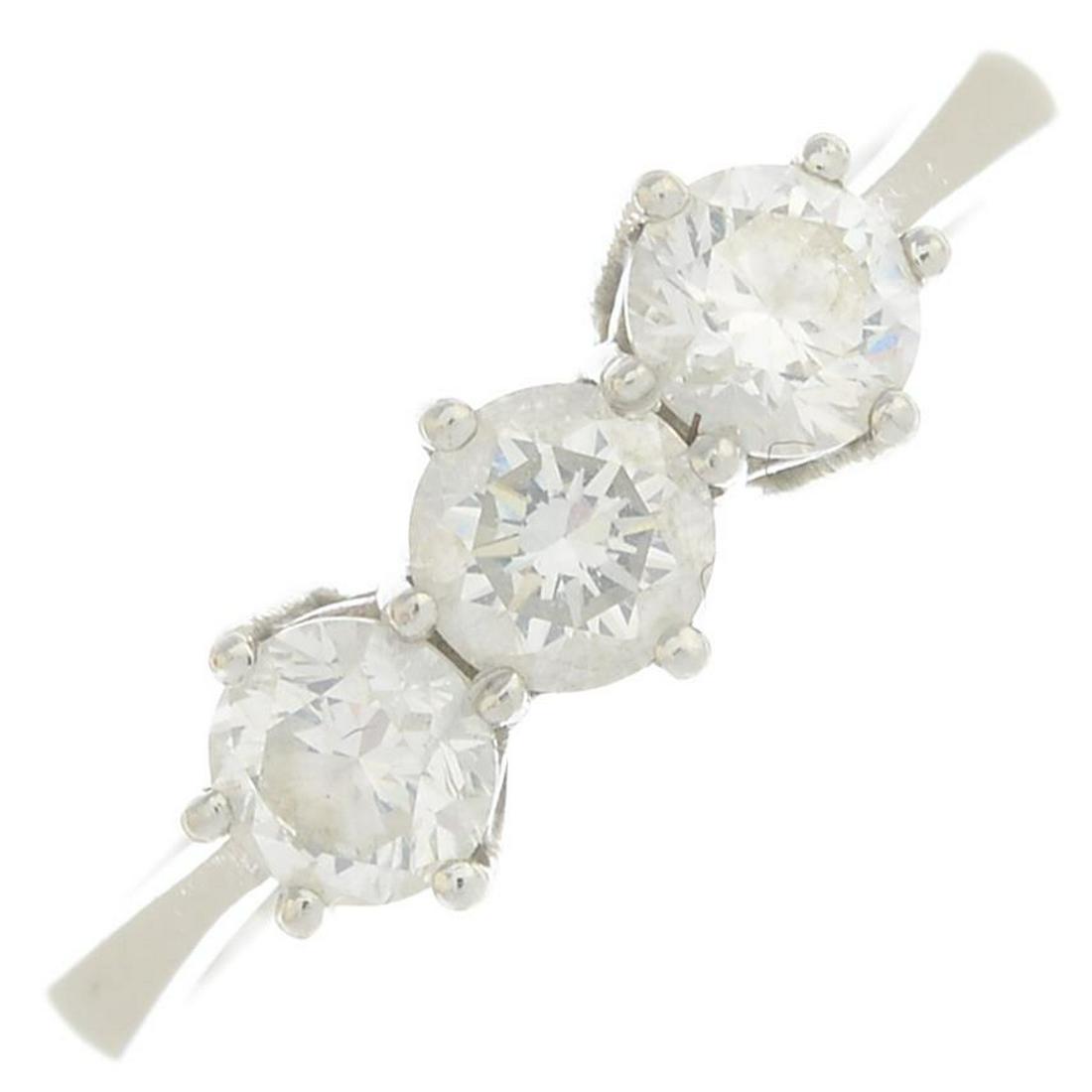 SoldA platinum diamond three-stone ring.A platinum diamond three-stone ring. The brilliant-cut diamond, with similarly-cut diamond sides to the plain band. Estimated total diamond weight 1.20cts, J-L colour, SI clarity. Hallmarks for BirminSee Sold Price