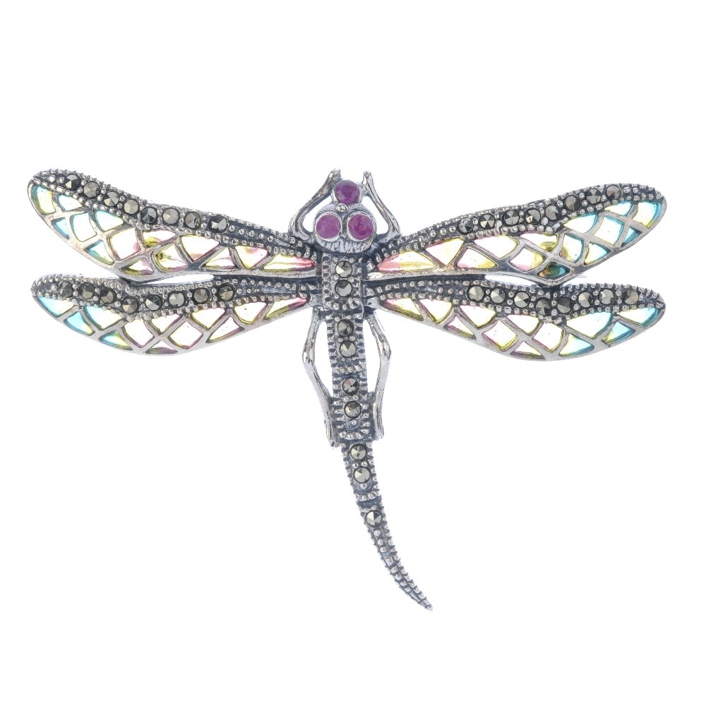 A plique-a-jour enamel, ruby and marcasite dragonfly