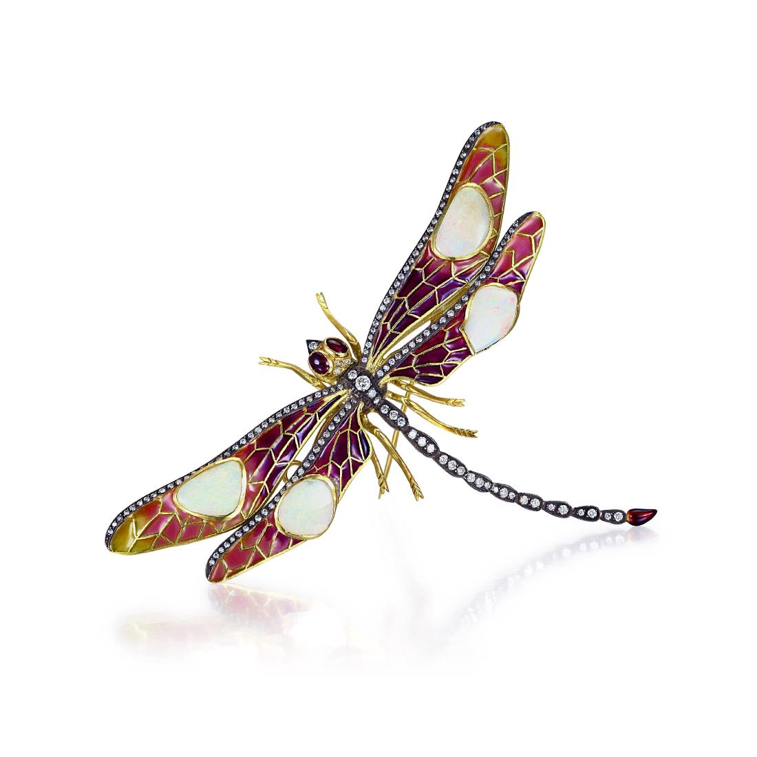 A Plique-A-Jour, Opal, Diamond, Ruby Dragonfly Brooch