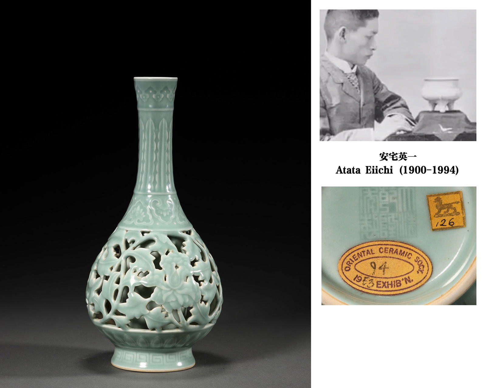 A PLUM-CELADON GLAZE OPENWORK FLORAL VASE