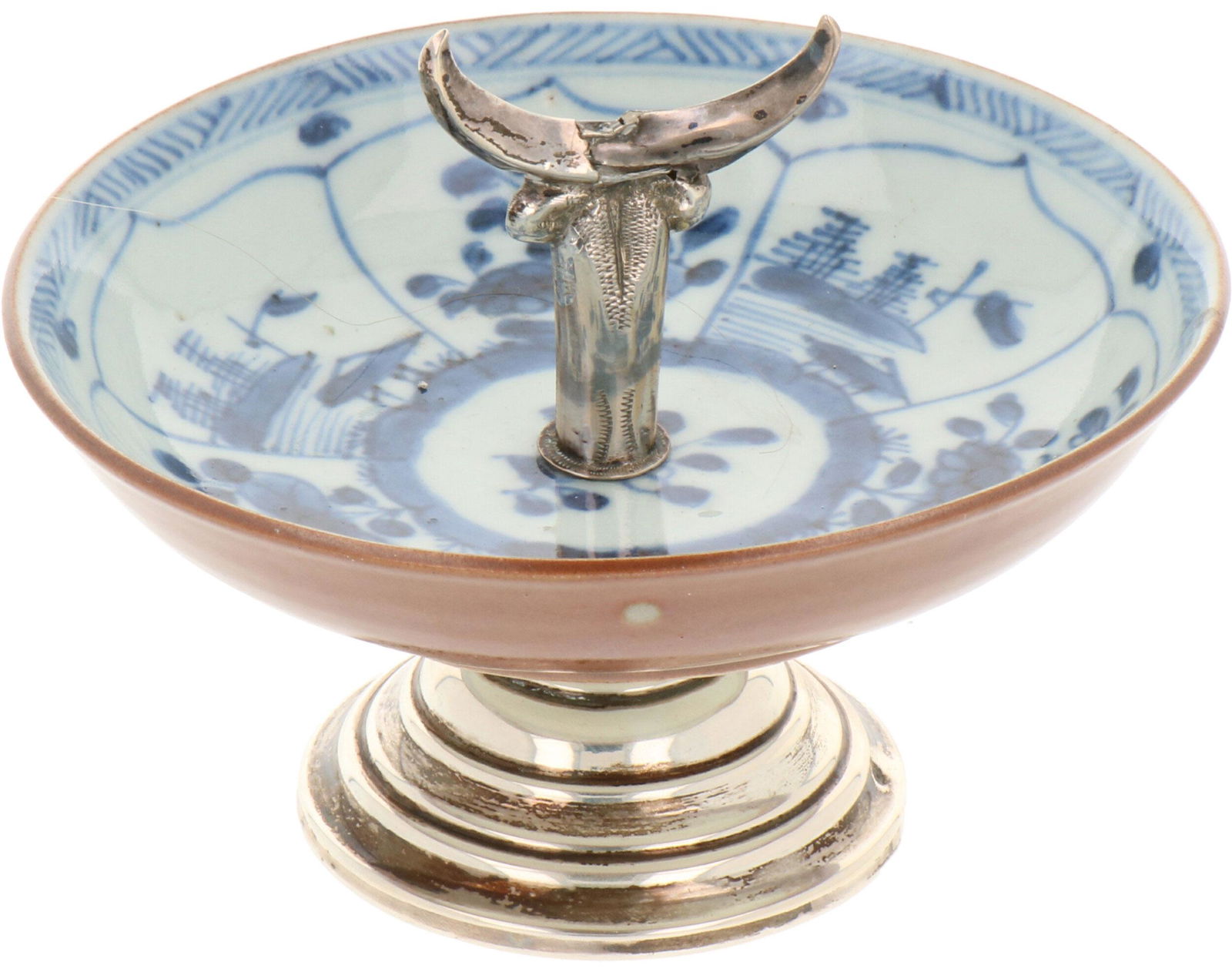 A porcelain capuchin dish with silver frame. China,