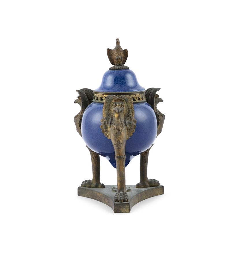 A POWDER BLUE AND ORMOLU MOUNTED GLOBULAR POT-POURRI