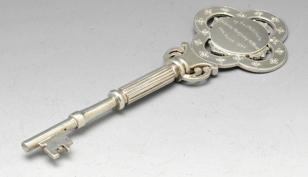 SoldVICTORIAN SILVER PRESENTATION KEY, DATED 1899 Maker’s Mark: J.A.S., Birmingham, 1899Length: 4 3/4 in. (12 cm); Weight: 67.5 g This fine Victorian silver ceremonial key bears full Birmingham hallmarks for 1899 and is inscribed: "Presented to Mr. Wm. Fletcher by the officials & few friSee Sold Price