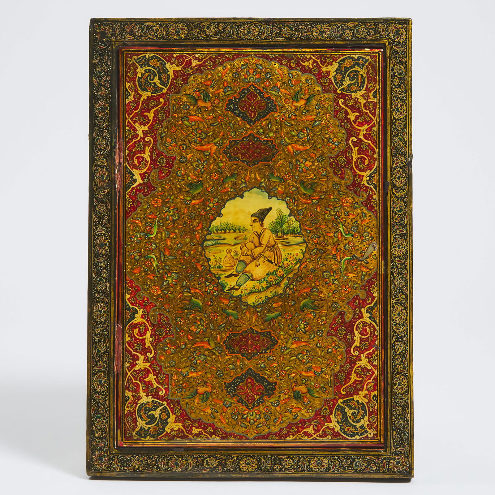 A Qajar Polychromed Lacquer Papier Maché Mirror Case, Persi