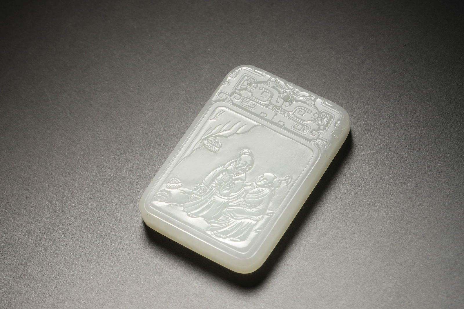 SoldA White Jade Incised Plaque QingA white jade plaque with one side carved figural story scene, while the other side with inscription, the stone overall in pale celadon color tone, 5x3.9cm 清 人物詩文See Sold Price
