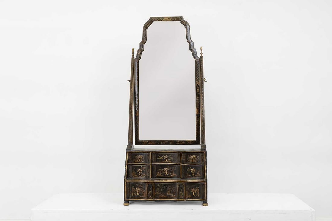 A Queen Anne-style black-lacquered dressing table mirror,