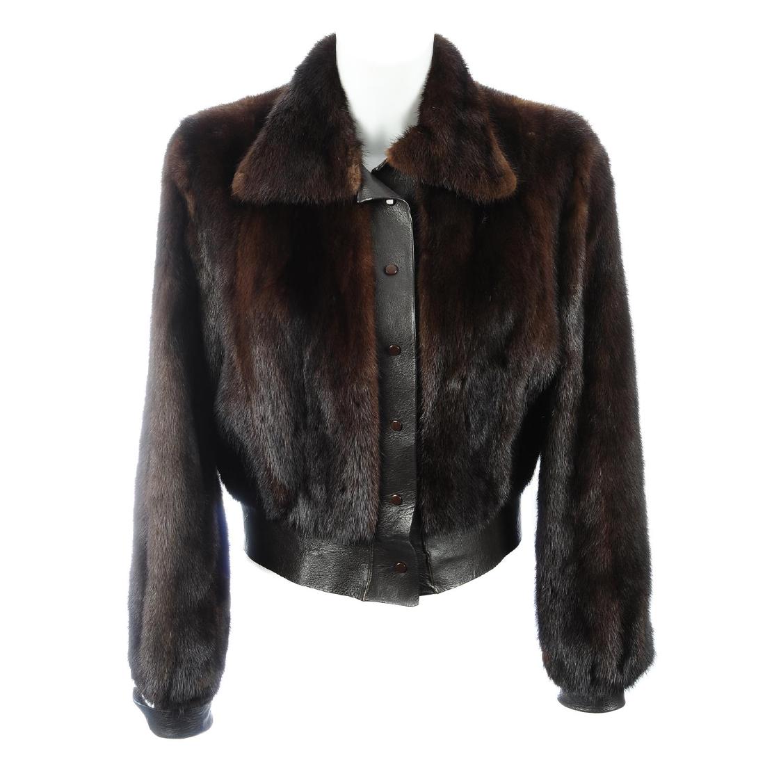 A ranch mink jacket. Designed with brown leather trim,