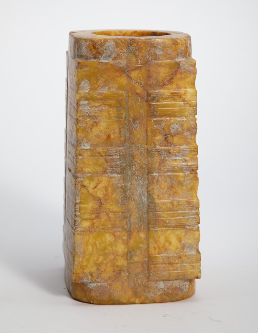 SoldA Chinese Jade Cong with/StandA square shaped yellow jade carved cong. H: 6.2cm 古玉琮連底座 Click here for natural light detailed photos 點擊查&See Sold Price