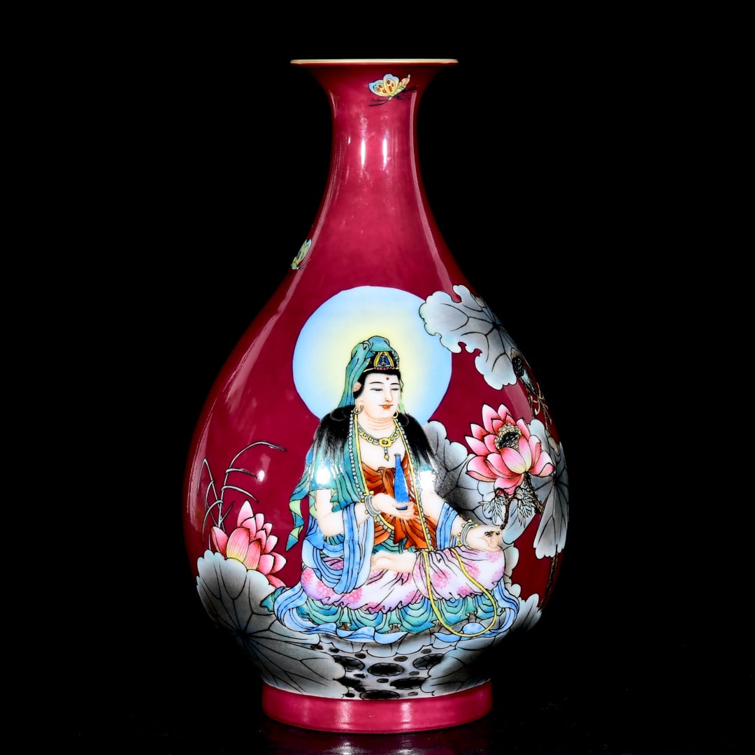 A Rare Ruby Red-Glazed Enamel Avalokitesvara Pattern Vase,With Poem