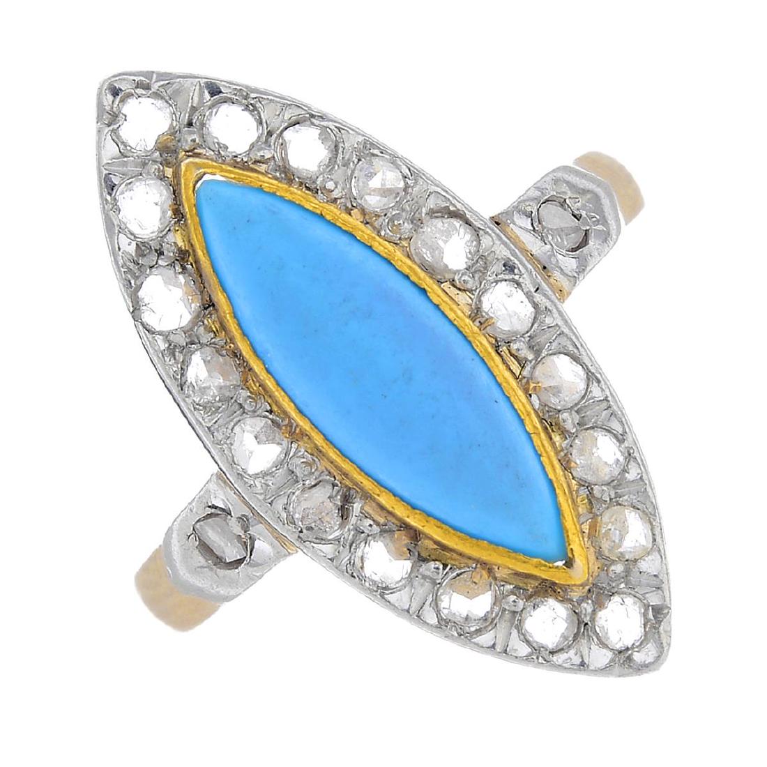 A reconstituted turquoise and diamond cluster ring. The