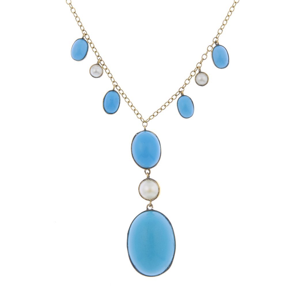 A reconstituted turquoise, paste and split pearl