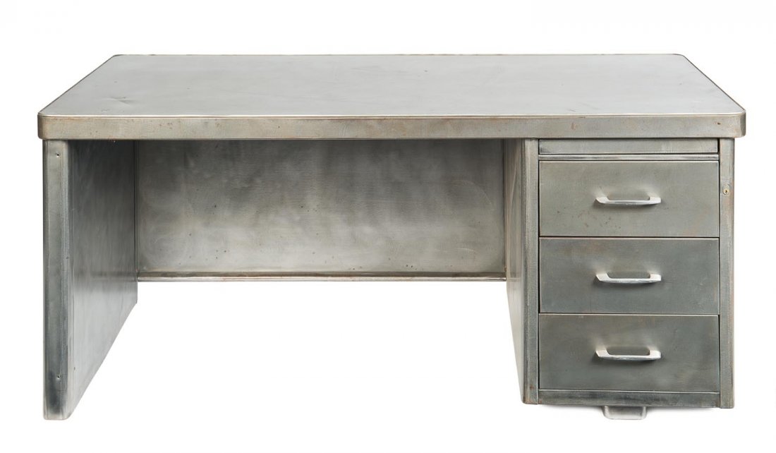 A rectangular three drawer steel desk, French, Circa