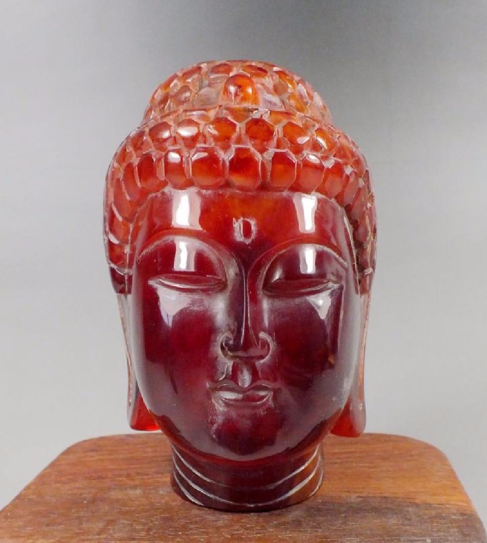 A RED AMBER CARVING BUDDHA HEAD STATUE.
