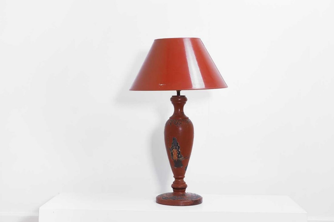 A red-lacquered table lamp,