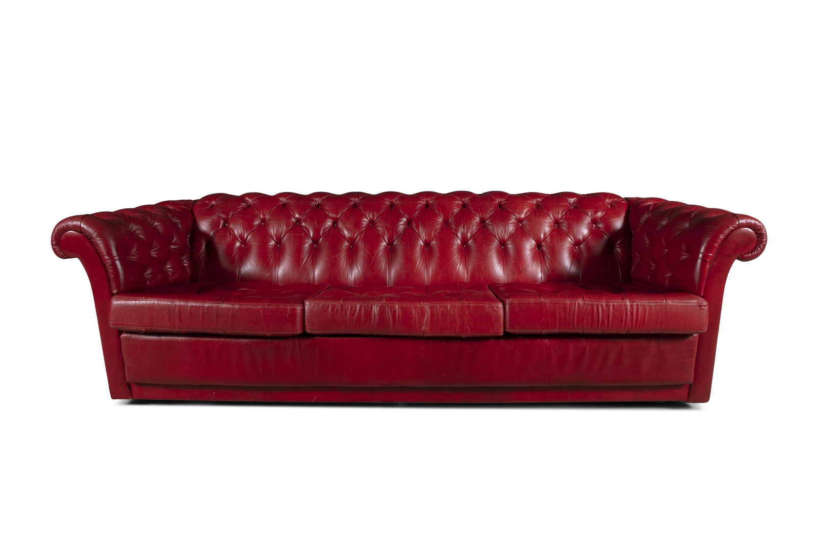 A RED LEATHER THREE-SEATER BUTTON BACK SOFA, with