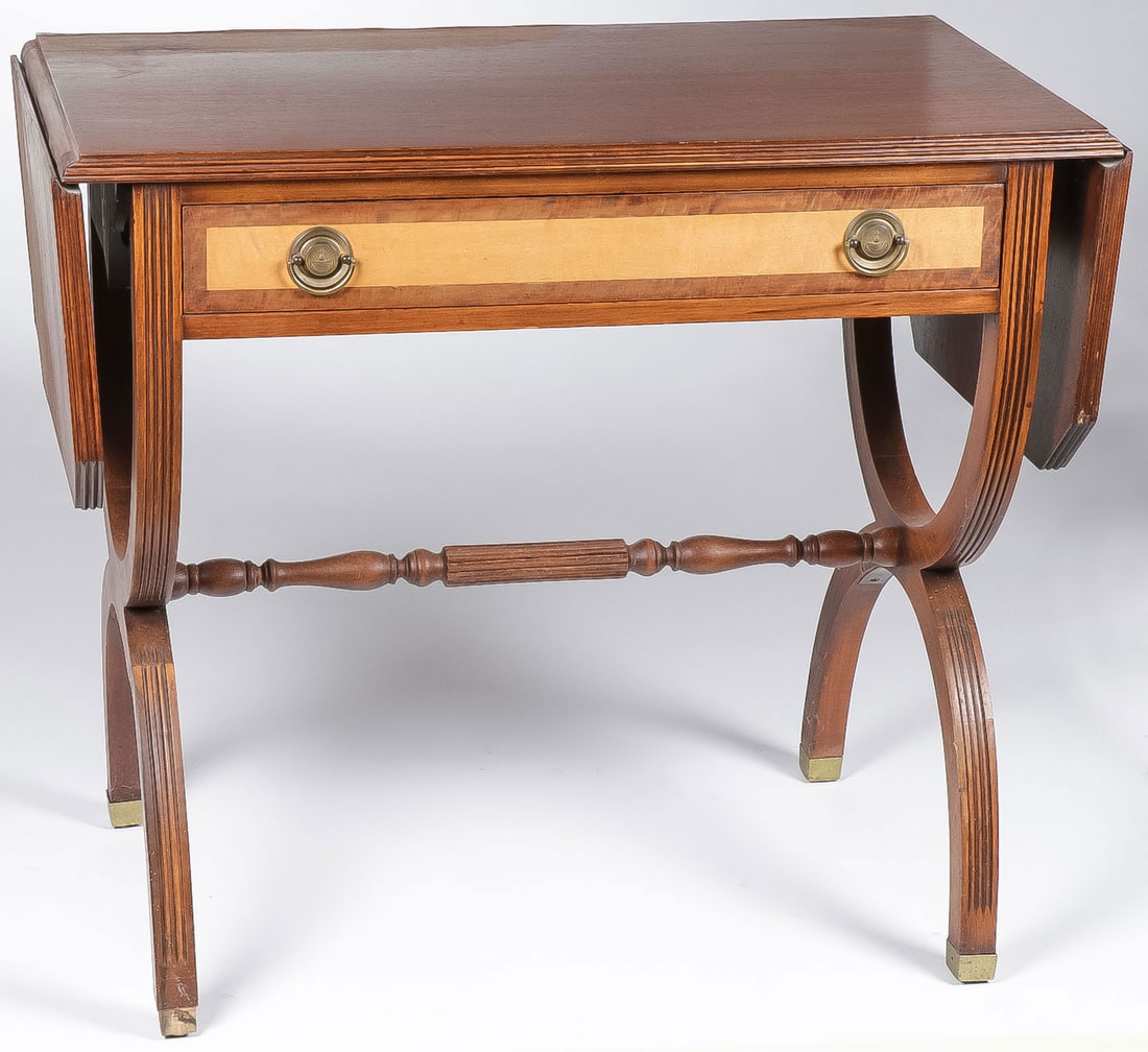 A REGENCY STYLE STRING-INLAID AND CROSS BANDED MAHOGANY SOFA TABLE, with inverted serpentine-frontedA REGENCY STYLE STRING-INLAID AND CROSS BANDED MAHOGANY SOFA TABLE, with inverted serpentine-fronted top above three frieze drawers, raised on pillar ends joined by a turned stretcher, continuing to m