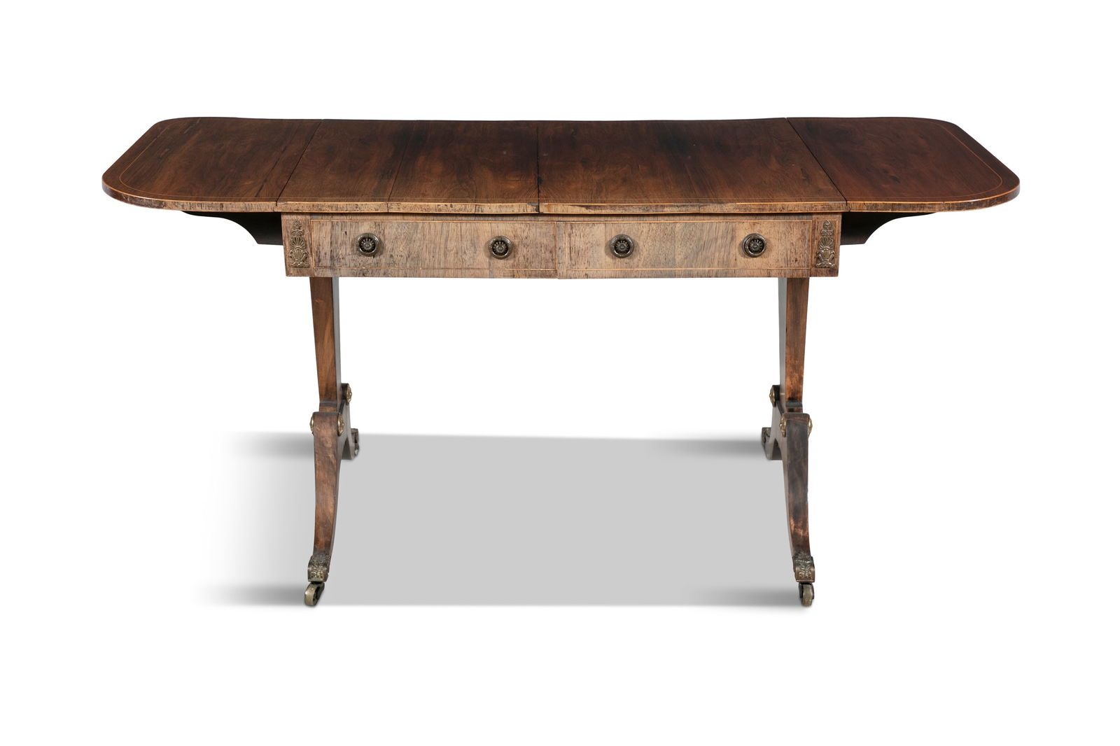 A REGENCY INLAID ROSEWOOD RECTANGULAR DOUBLE DROP LEAF SOFA TABLE, the top with boxwood stringing