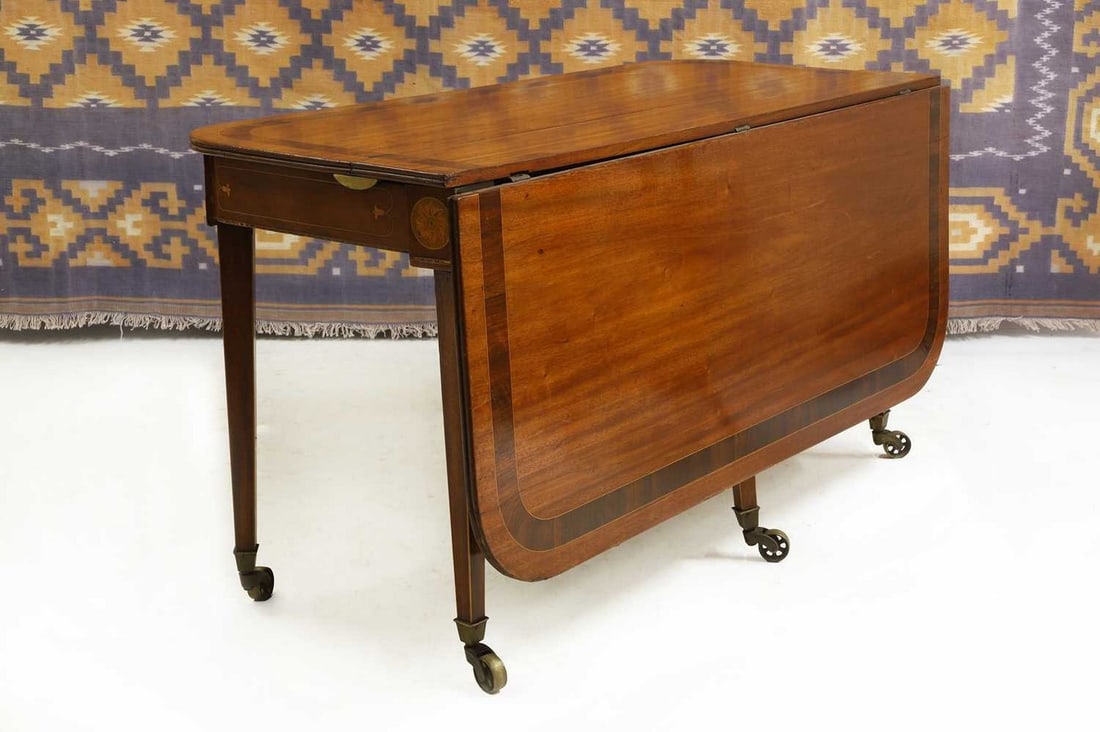 SoldAmerican Mahogany D-End Dining TableAmerican, possibly Philadelphia mahogany dining table with two D-ends and a central drop-leaf. Features inlaid detail around the feet. Dimensions: overall size 29 1/2" tall, 111" long, 48" deep; D-endSee Sold Price