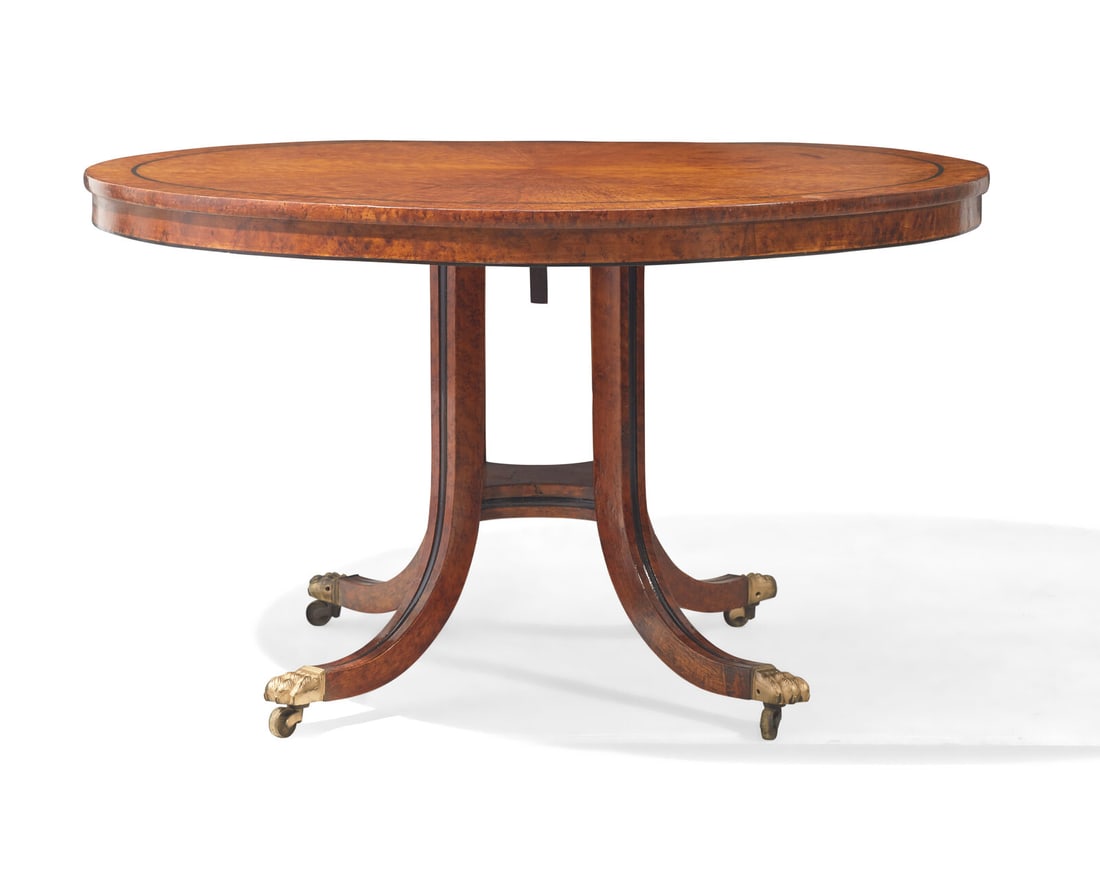 Gillows-made Regency pollard oak sofa table, second quarter 19th century, the banded rectangular topGillows-made Regency pollard oak sofa table, second quarter 19th century, the banded rectangular top with two rounded drop leaves above a frieze fitted with two drawers, raised on four ribbed and turn