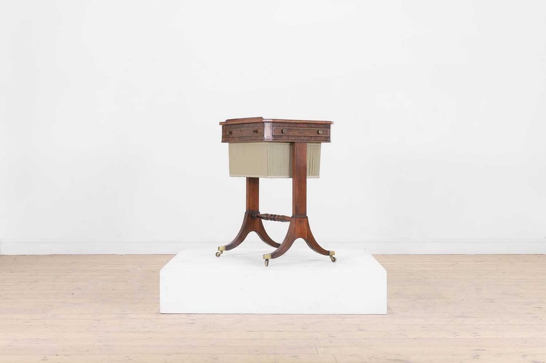 A Regency rosewood, pollard oak and brass worktable,