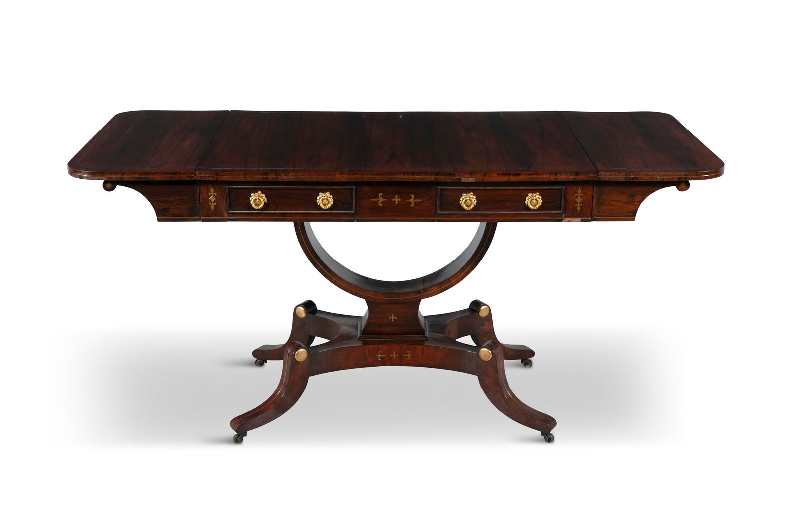 A REGENCY ROSEWOOD RECTANGULAR DOUBLE DROP LEAF SOFA TABLE, with brass stringing, fitted twin