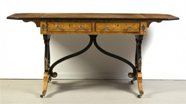 SoldRegency Style Maple Leather-Inset Writing Desk20th C. label inside from Sligh-Lowry. Chips, surface distress, lacking glass top. 29"h x 4'1-3/4"h x 25-3/4"d Provenance: Property from the Estate of Dr. Samy IosubSee Sold Price