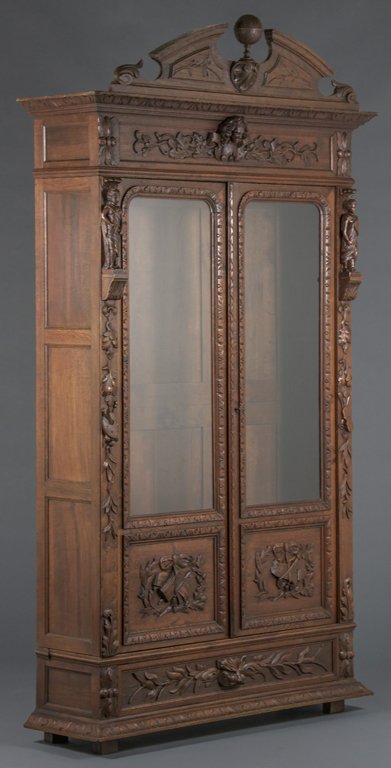 SoldFRENCH RENAISSANCE REVIVAL VITRINE BOOKCASEFrench Renaissance Revival vitrine bookcase, with carved apron, lion head carved appliqués, claw feet, floral motif carving, and burl applications. Approximate dimensions: h. 77", w. 88", d. 23" DiscSee Sold Price