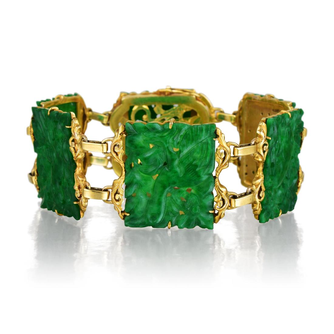 14K yellow gold Ming's jade cabochon bracelet with Chinese character spacers. 6 3/4"L x 5/8"WRipley Auctions4.4(197)$300(1 bid)2 days Left