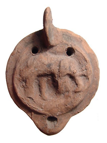 A Roman ceramic lamp with an elephant