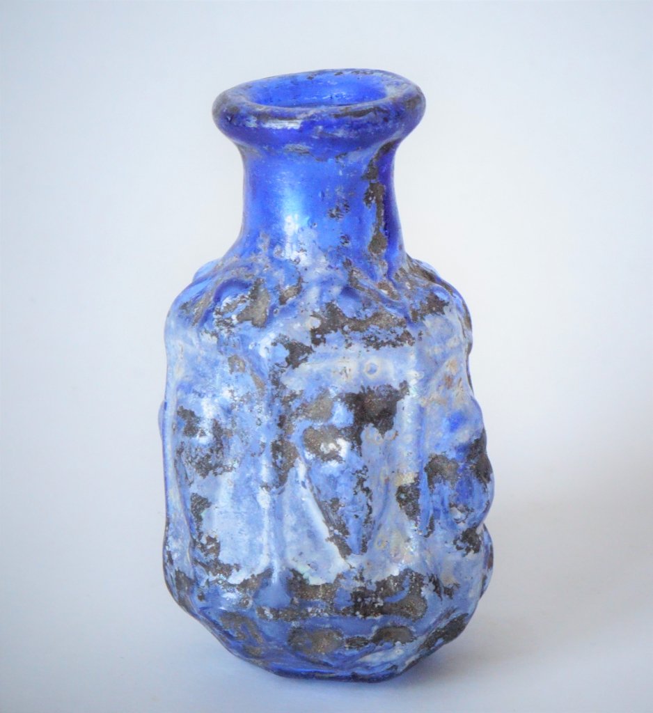 A Roman Sidonian Hexagonal Blue Glass Bottle
