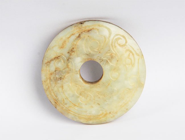 SoldChinese Jade Carved Plaque w/ Dragon, Ming DynastyChinese jade carving of a plaque, dated from the Ming Dynasty, carved on both sides with a scrolling design with dragons around a central circular "Bi"disc design with a aperture in the middle, smoothSee Sold Price