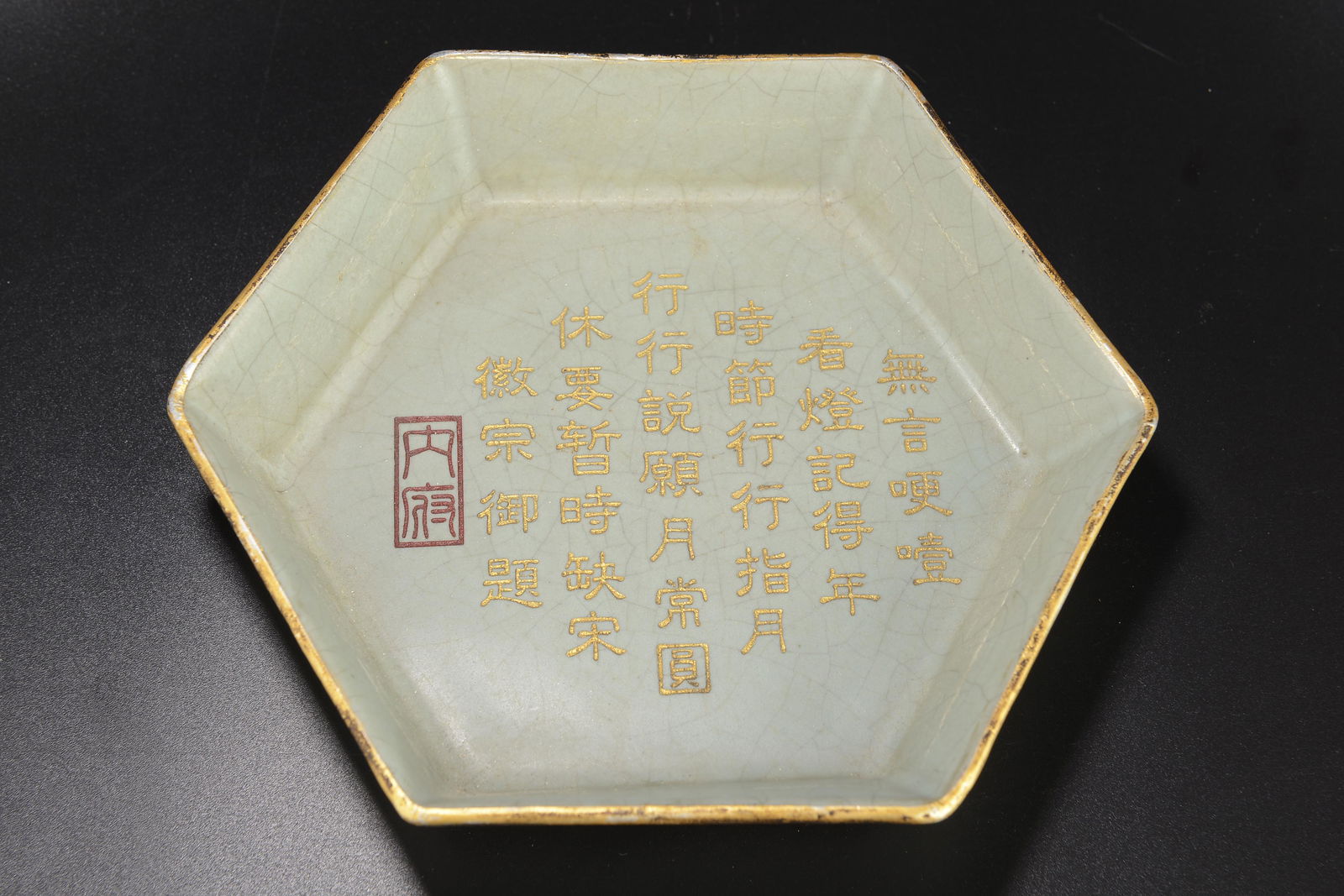 A RU-GLAZED HEXAGONAL DISH.