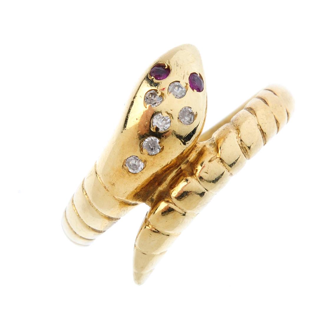 SoldA RUBY AND DIAMOND SNAKE RING in 18ct yellow gold, designed as a coiled snake, the head set with anA RUBY AND DIAMOND SNAKE RING in 18ct yellow gold, designed as a coiled snake, the head set with an old cut diamond, the eyes set with round cut rubies, no assay marks, size Q1/2 / 8.5, 5.1g. See Sold Price