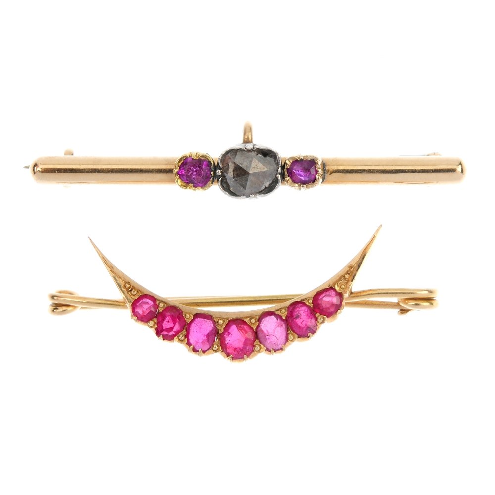 A ruby and diamond brooch and a gem-set crescent brooch