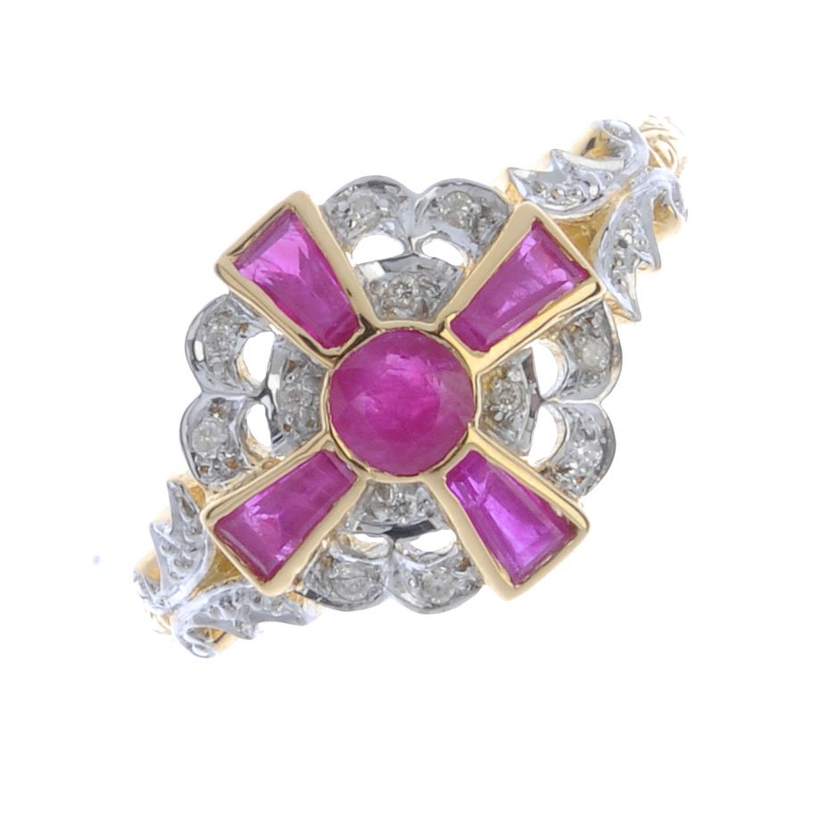 A ruby and diamond dress ring. The vari-cut ruby cross,