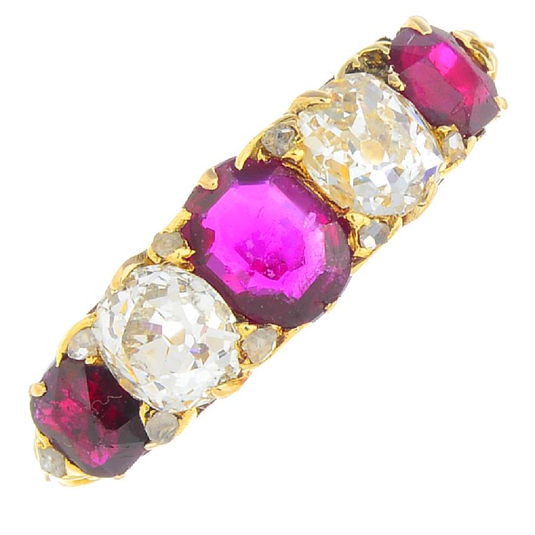 A ruby and diamond five-stone ring. The alternating