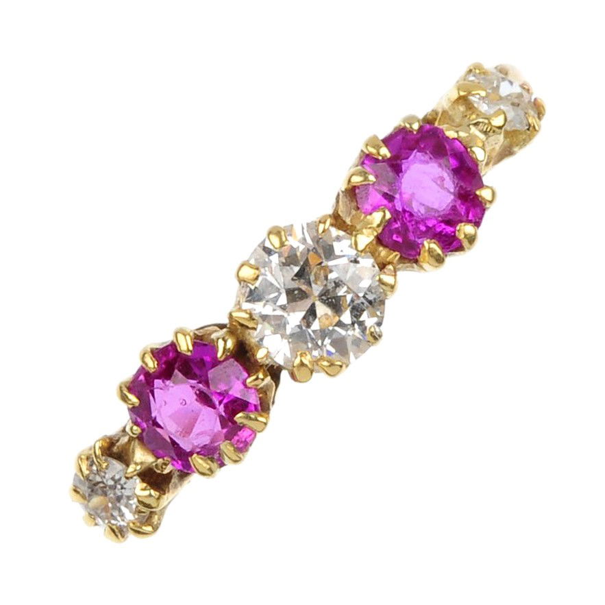 A ruby and diamond five-stone ring. The graduated