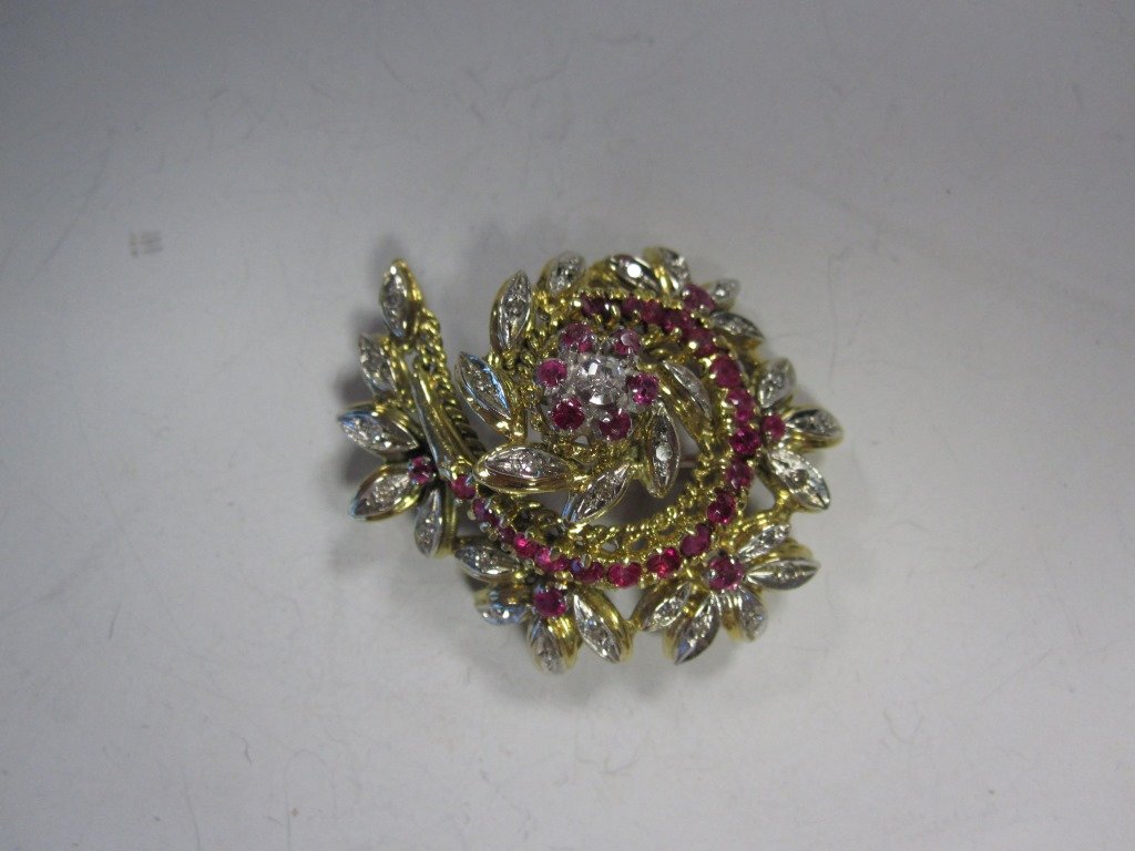 SoldA Large Retro Multi Tone 14k Gold Ruby Diamond Brooch PinA Large Retro Multi Tone 14k Gold Ruby Diamond Brooch Pin. A Very Large & substantial ribbon-form retro period (Circa 1950s) brooch pin. The brooch features a lovely contrast in tones of Gold as wellSee Sold Price