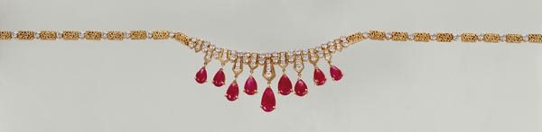 Sold14 kt y/g burmese ruby diamond necklaceAn extremely rare Burma natural ruby with 14 kt yellow gold and diamonds. Total ruby 27.96 carats, and diamonds 6.37 total carats. Appraisal value $83,590.See Sold Price