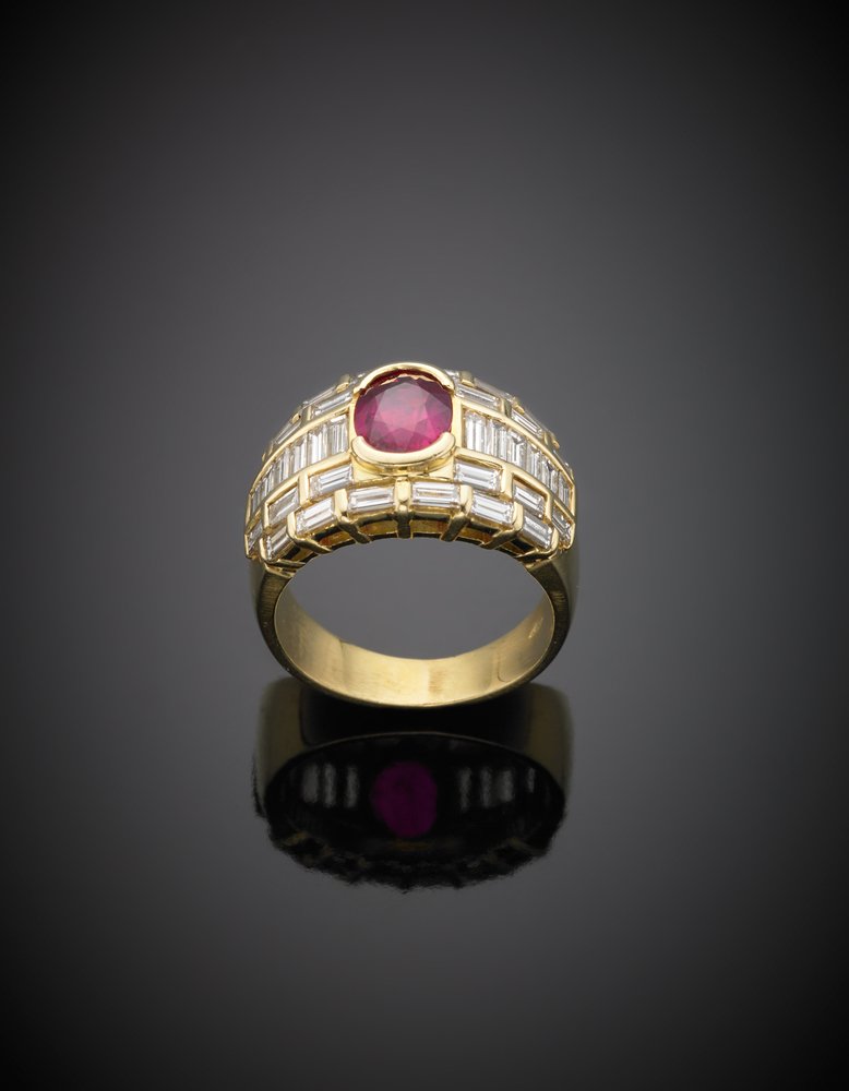 A ruby and diamond gold cluster ring, g. 11,70, size